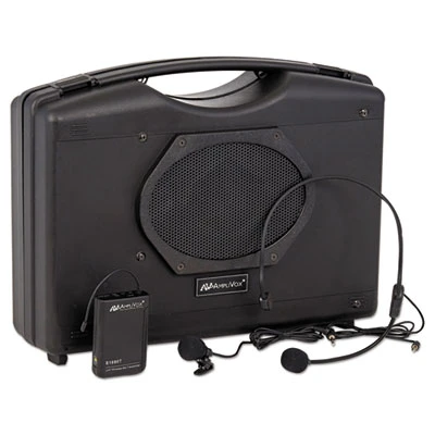 A complete presentation system built into a rugged, compact carrying case. Reach up to 1,000 people outdoors or in rooms up to 10,000 square feet. Using Bluetooth wireless technology, stream audio wirelessly from your smartphone, tablet, or any other Bluetooth® enabled device. Includes built-in 16-channel UHF wireless receiver and lapel and headset microphones with wireless transmitter bodypack. By adding a second Wireless Mic Kit (sold separately) two presenters can be wireless simultaneously with the freedom to roam within a 300 ft. radius. Powered by ten D-cell batteries for up to 200 hours of talk time or choose optional rechargeable NiCad battery pack (requires S1460). Mic Input Types: Condenser; Dynamic; Wireless; Number of Mic Inputs: 3; Speaker Type: 6 x 8 Jensen Speaker; Number of Speakers: 1.