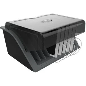 | The CSD1006USB 10-Device Desktop USB Charging Station provides USB charging, secure storage and cord management for up to 10 tablets, iPads and e-readers up to 10.5 inches. It’s recommended for schools, offices, warehouses, retail outlets, worksites, healthcare facilities and anywhere else multiple mobile devices are used.Your devices plug into the 10 USB ports as needed for proficient charging. The CSD1006USB delivers up to 5V 2.4A per port, which is plenty of power for charging battery-intensive devices. To protect your devices, the CSD1006USB prevents them from drawing more power than it is capable of supporting and stops charging a device when the device’s battery is at 100%.The CSD1006USB locks with the included keys to help prevent theft, damage or tampering. A cable with combination lock is also included to secure the charging station to a desk, table, cart or other flat surface. The six-foot AC input cord with NEMA 5-15P plug helps you place the charging station in a convenient location. Storage shelf dividers are easily removed to accommodate thicker devices. Cabling is secured beneath the shelf tray to alleviate clutter.