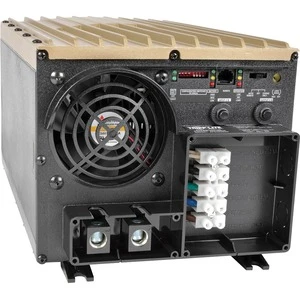 Tripp Lite’s APS3636VR DC-to-AC inverter with automatic line-to-battery transfer and integrated charging system serves as an extended run UPS, a standalone power source or a truck/RV/Industrial inverter. Supplies up to 3600 watts of continuous 120V AC power from any 36V battery. OverPower inverter output feature temporarily provides up to 150% of the continuous output for 1-60 minutes and DoubleBoost inverter output feature delivers up to 200% of the continuous output for up to 10 seconds, providing the extra power needed to cold start heavy-duty tools and motorized equipment. When hardwire AC input is energized, commercial power passes through to connected equipment and the battery set is recharged via 3 stage, 30 amp charging system. In UPS mode, the APS system responds to blackouts and severe voltage fluctuations with a near instantaneous automatic transfer to battery-derived AC output. Includes a set of high current DC input terminals for simple installation (user supplies batteries and cabling – see owner’s manual for recommendations). Passes sine wave utilty or generator power during battery charging and UPS line power operation, plus efficient PWM sine wave AC output in inverter and UPS backup modes. Built-in Automatic Voltage Regulation (AVR) corrects line power AC brownouts and overvoltages without using battery power during battery charging and UPS standby modes. Reliable large transformer design, with frequency control powers resistive electronic loads or large inductive motors, compressors and other items with high current needs on startup. Included APSRM4 wired remote power switch with full status LEDs provides remote power inverter on/off switching and continuous status information. Supports an unlimited amount of runtime with any number of user-supplied batteries connected. Highly adaptable to a variety of applications and site conditions with adjustable charger settings for wet/gel battery types and selectable line to battery power transfer voltages. |